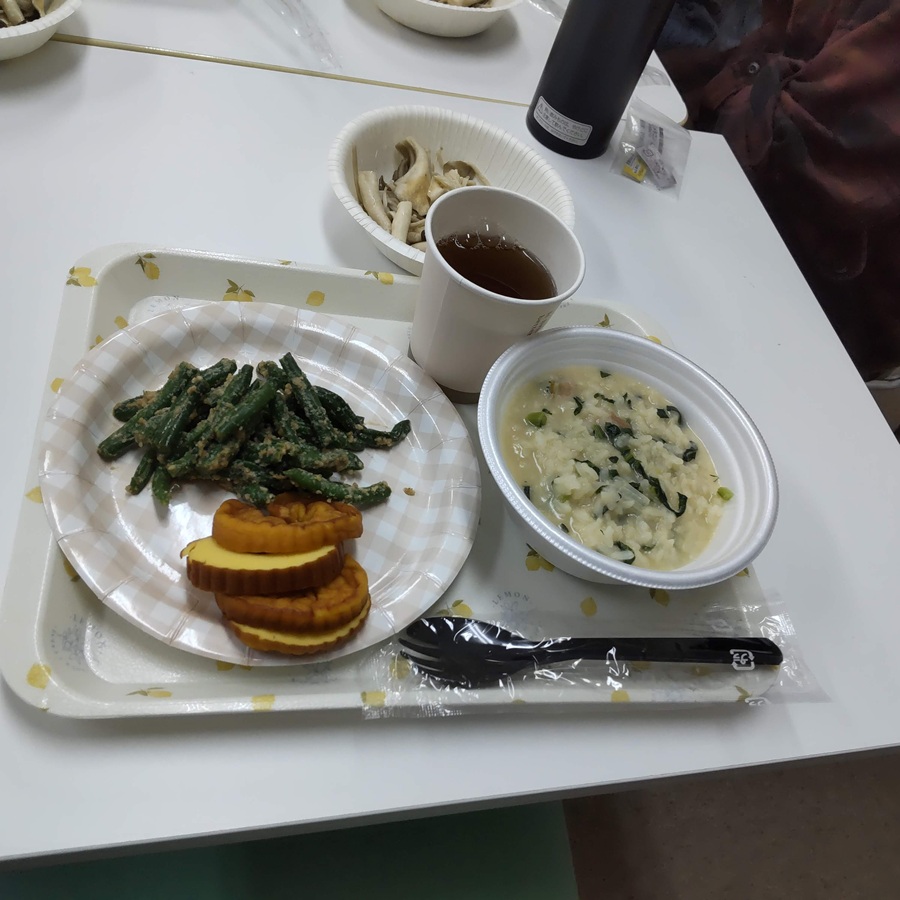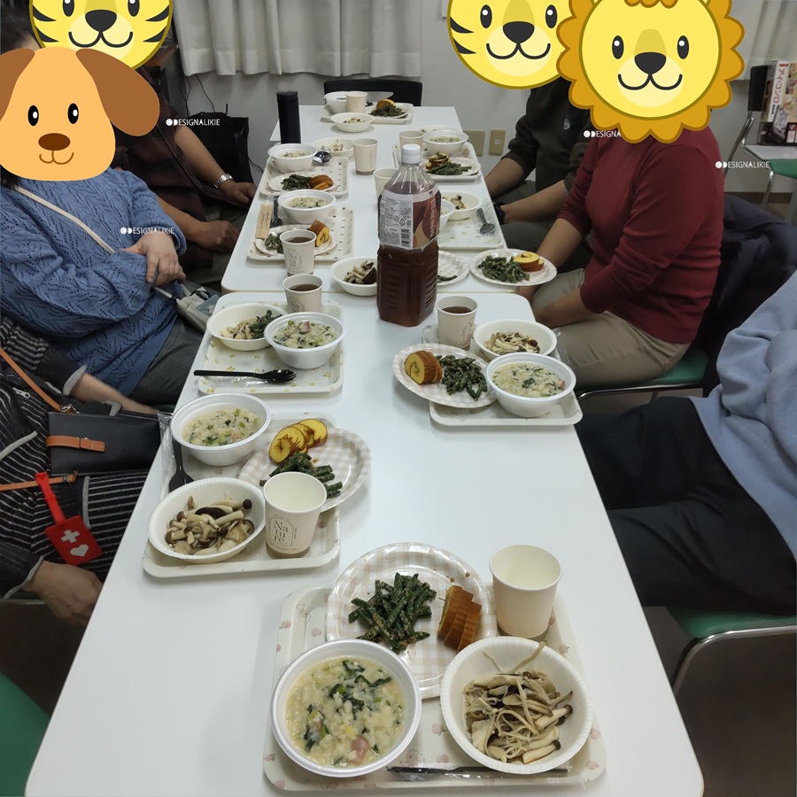 今月のテーマは、お正月の食べすぎをリセットする「体にやさしい献立」です。 メニューは、メインの豆乳おじやをはじめ、きのこのホイル焼き、いんげんの胡麻和え、さらに季節を感じる伊達巻やおしるこ。メインのおじやは、仕上げをメンバー自らが行いました。出来立ての温かさと豆乳の優しい味わいが体に染み渡り、心もお腹も整いました。