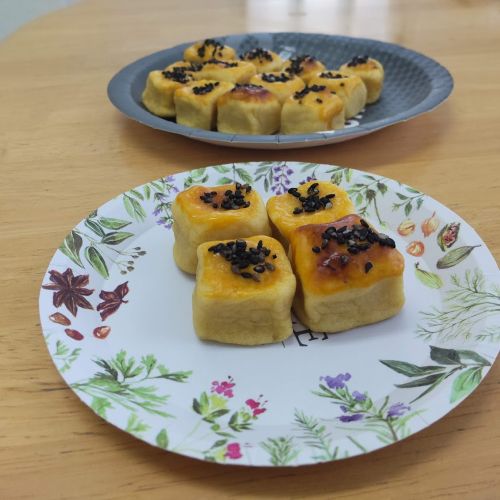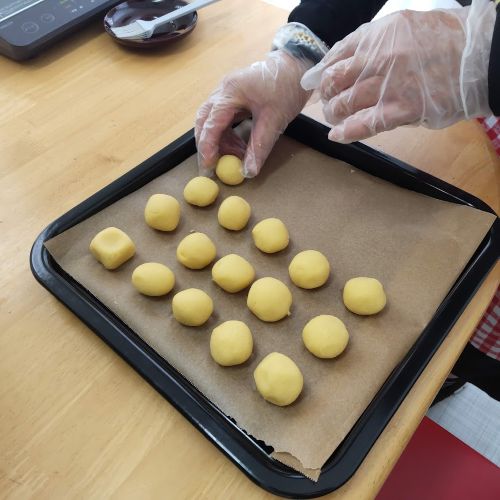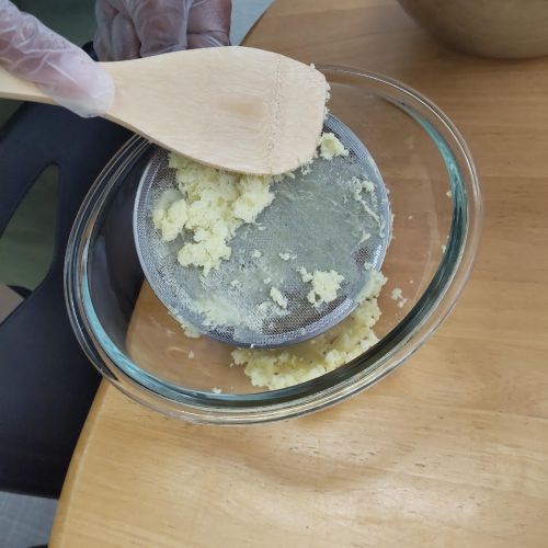 9月25日㈭のお菓子作りプログラムでは、スイートポテトを作りました。まずはさつまいもを茹でて潰す作業からスタート。さらに食感を格段になめらかにするため、裏ごしを行いました。裏ごしの作業は、少し力が必要で根気のいる作業でしたが、皆で力を合わせ、丁寧にさつまいもの繊維を取り除きました。そのおかげで、口どけの良い極上のスイートポテトが完成!翌日の糸ぐるまカフェで提供し、皆で美味しく頂きました。作ったメンバーからも「苦労して裏ごしした甲斐があった」「大変だったけど美味しくできてよかった」という声が上がり大好評でした。