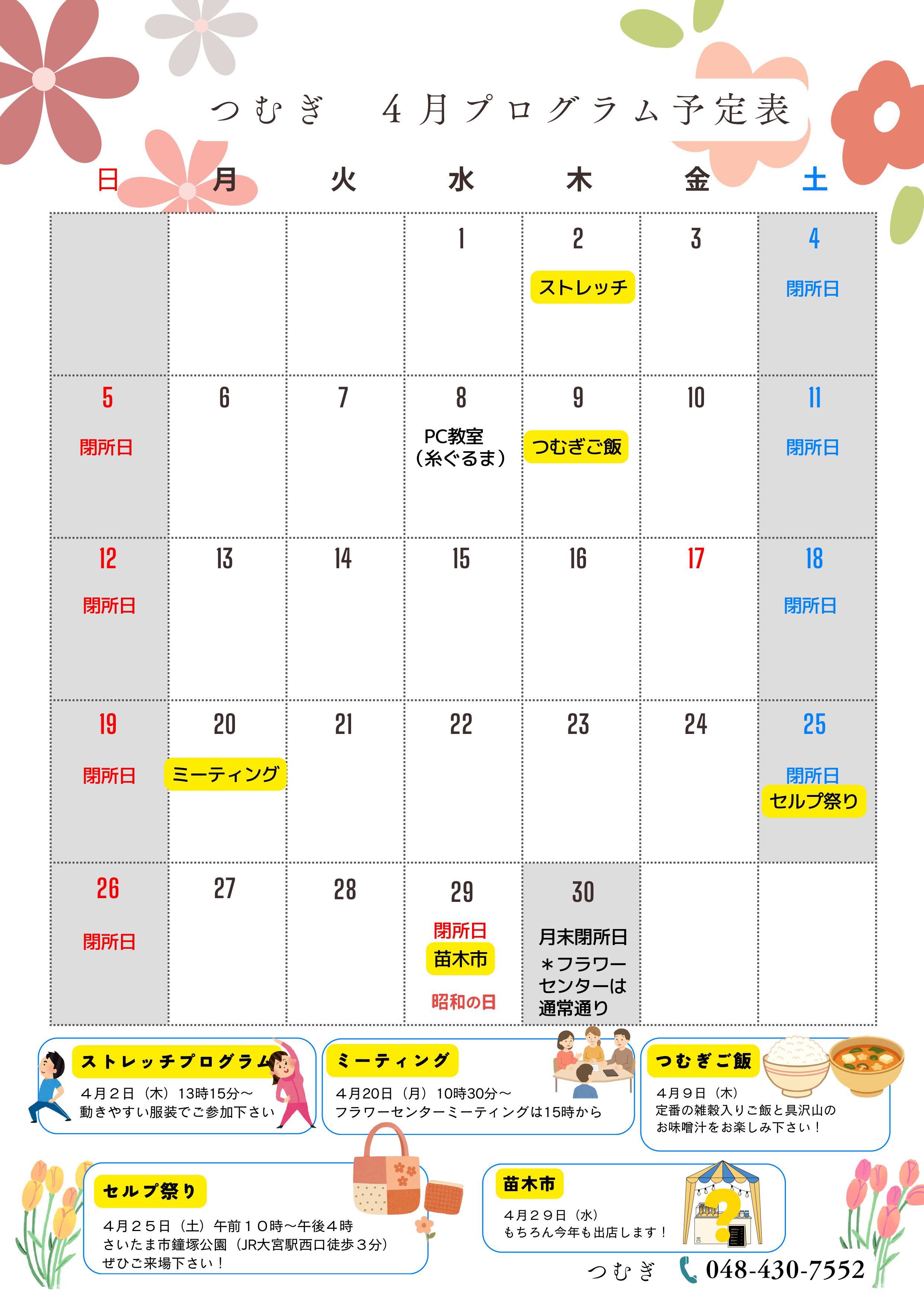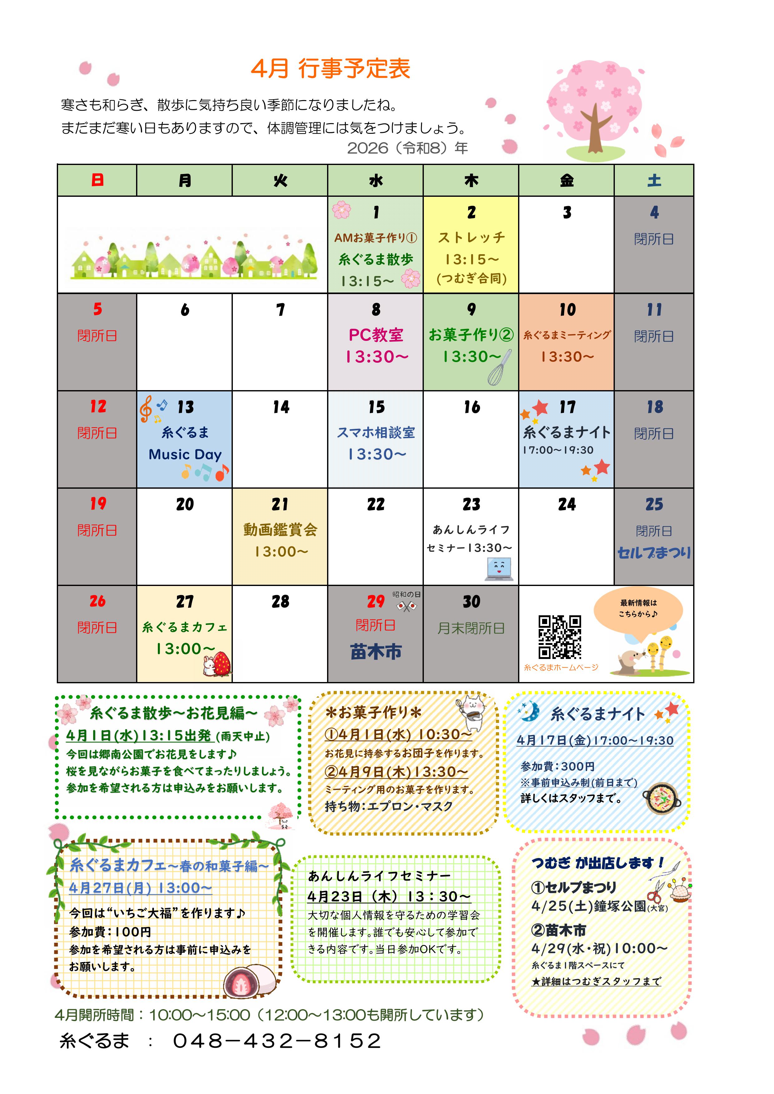 ★現在、午前(10:00~13:00)と午後(12:00~15:00)の入れ替え制となっています。※パソコン教室、糸ぐるまミーティングの日のみ1日を通して利用可能です。<4月つむぎ>