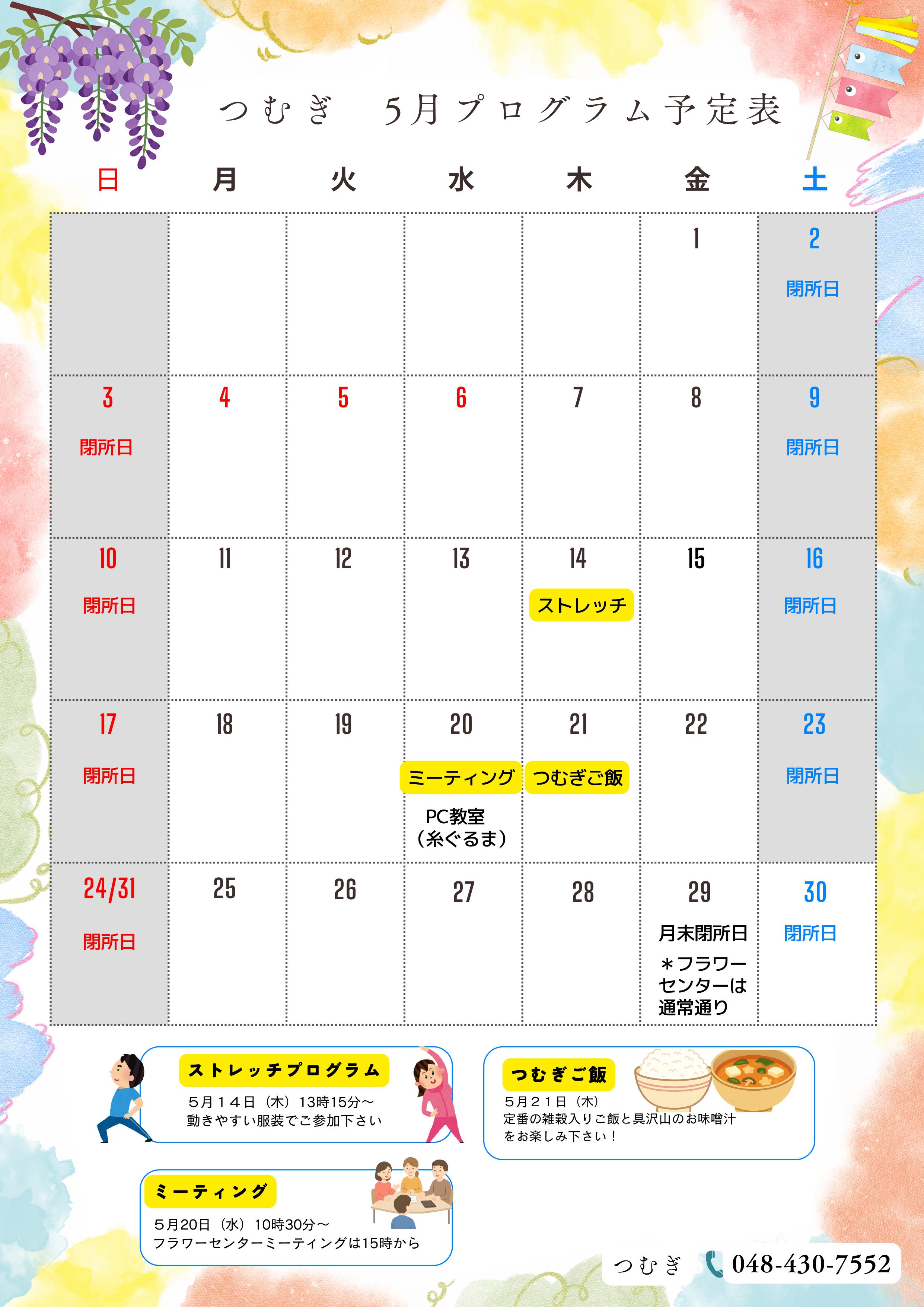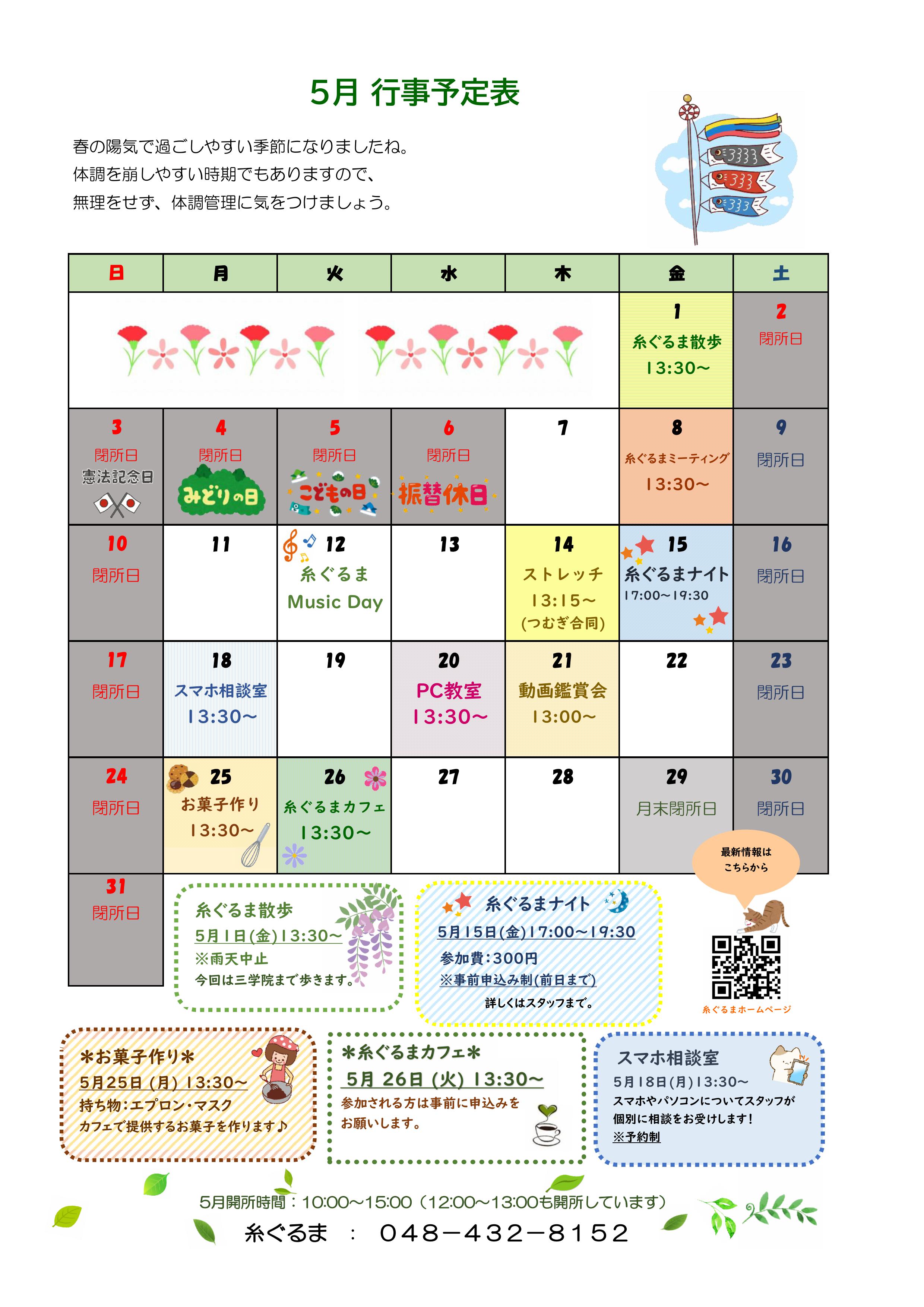 ★現在、午前(10:00~13:00)と午後(12:00~15:00)の入れ替え制となっています。※パソコン教室、糸ぐるまミーティングの日のみ1日を通して利用可能です。<5月つむぎ>