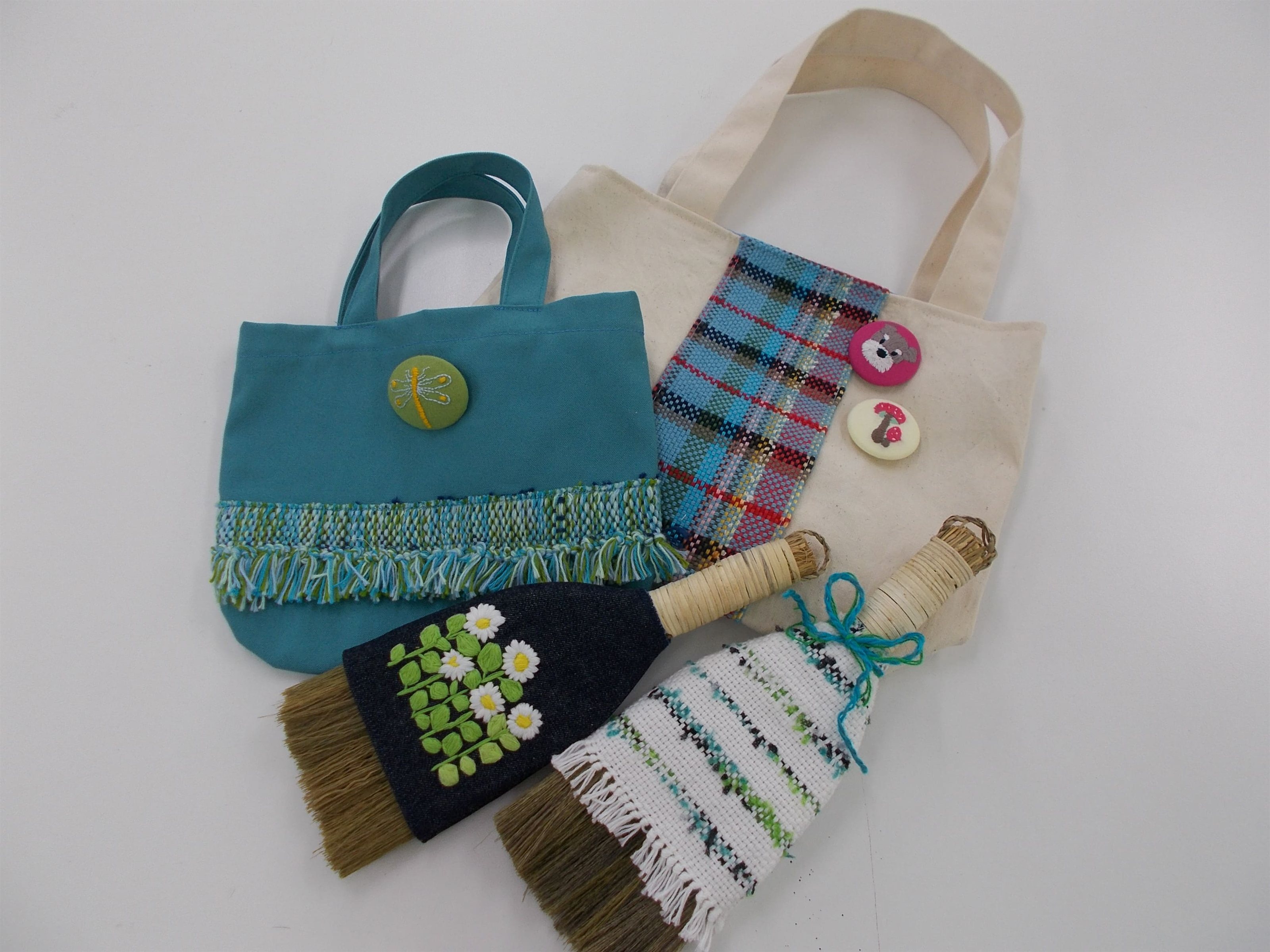 つむぎオリジナルデザインの肩掛けバッグ、ちいさな手織りモチーフの入ったトートバッグ。